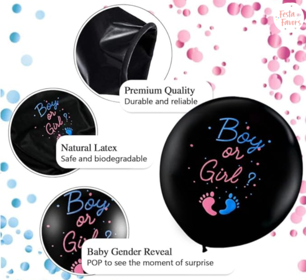 This black gender reveal balloon will pop! The package includes 2 black balloons, 1 x blue confetti for baby boys and 1 x pink confetti for baby girls making it ideal for your gender reveal party games.Â