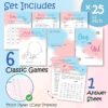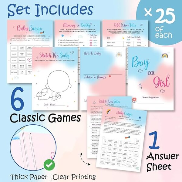 Complete Game Set | Includes 75 double-sided 5×7" cards with 6 diverse games for gender reveal, such as "Baby Shower Bingo," "Vote Boy or Girl," and the "Guess who Mommy or Daddy" plus an answer card, perfect for 25 guests |