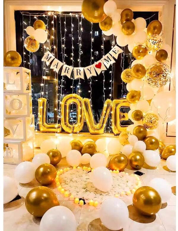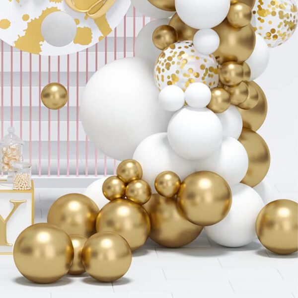White and gold balloons are often used for weddings, anniversaries, New Year’s Eve parties, or other formal occasions. They can be arranged as balloon arches, balloon bouquets, or simply scattered around the venue to add a touch of glamour and luxury.