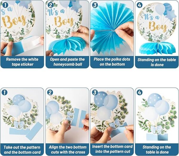 Included Items | 6 blue baby honeycomb balls, Baby table tops and clear glue |